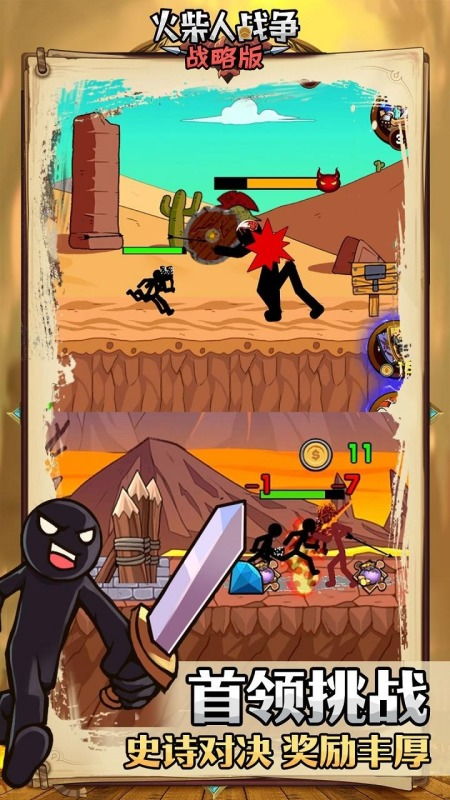火柴人战争中文版的玩法非常简单,玩家只需要通过点击屏幕,控制火柴人战士进行移动、攻击和防御。游戏中有多种武器和道具,玩家可以根据自己的喜好和战斗需求进行选择。