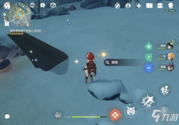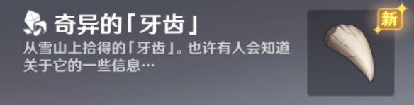 1. 在「龙脊雪山」地区4处点位中的任意位置找到【奇异的「牙齿」】,与其交互后获得相关道具【奇异的「牙齿」】