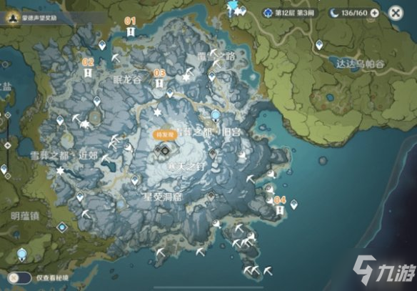 可以根据地图标点来收集所需材料,其中“感叹号”标记的为【奇异的「牙齿」】所在点位,“矿镐”标记的为【星银矿石】所在点位(图中点位收集完大约是61份【星银矿石】)此处有条件的建议队伍中配备「凝光」角色,可以很好地探测出附近【星银矿石】的位置。