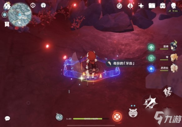 可以看到这里的【奇异的「牙齿」】被「古代坚冰」覆盖,在对岸可以找到「深赤之石」,拾取【深赤之石】后攻击此处的「古代坚冰」即可发现【奇异的「牙齿」】