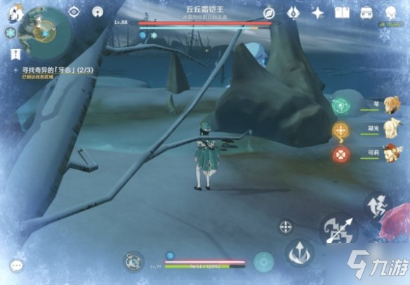 此处【奇异的「牙齿」】被结界四周环绕,由「丘丘霜铠王」看守,击败「丘丘霜铠王」后即可破除结界进去拾取【奇异的「牙齿」】。