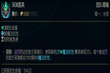 深渊面具在新版本重做之后,立马就获得了玩家的追捧,虽然失去了饭盒的被动效果,但作为一件魔抗装备,深渊面具绝对是超模的,2400的价格,你可以买到300血量、60魔抗,还有10减CD,被动依然是经典的减魔抗加魔抗,自然之力被削弱后,深渊就是大树的首选。