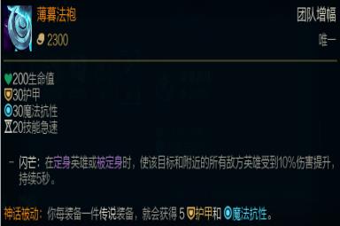 而上单大树的神话装备薄暮法袍,也是将大树打团的特性发挥到极致,别看薄暮法袍属性不咋地,但他的被动是真的强,目标及附近的敌人,受到10%的伤害增幅,大树QWR浑身控制,几乎能将这个debuff持续挂在敌人身上。