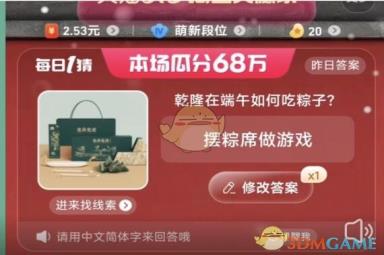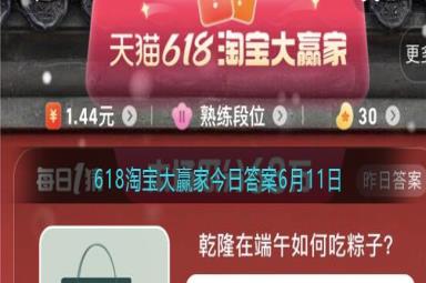 乾隆在端午如何吃粽子?这是2023年618淘宝大赢家今日答案6月11日活动题目,想必很多朋友不清楚今日的答案,下面是小编给大家带来的618淘宝大赢家今日答案,正确答案是【摆粽席做游戏】。端午节是我们的传统节日,淘宝大赢家今天的每日一猜答案直接在提供的线索页面能找到,但不是直接写出来的大家需要总结归纳下。