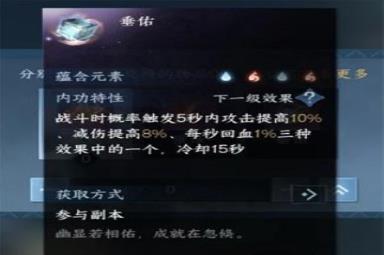 内功特性:战斗时概率触发5秒内攻击提高10%、减伤提高8%、每秒回血1%三种效果中的一个,冷却15秒