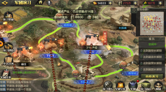 可通过消耗粮食上阵将领自助演习攻城略地,占领据点,持续获得大量的经验与物资,军职越高可挂机的队列越多,可获得的奖励越丰厚,同时在演习期间占领的据点越多军团升级的速度也就越快。